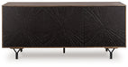 | Details | Made with solid mango wood sides, top and interior; doors made with engineered wood; back made with mango veneer and engineered wood substrate, Gray-brown and deep brown finish, “Y” shaped metal legs with black finish, 3 doors with carved starburst pattern and push magnet door function, 3 removable shelves, Openings in back for electronics, Assembly required | |