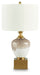 Details Made of brown and white art glass and metal with drum hardback fabric shade, Goldtone metal, 3-way switch, 1 E26 socket, type A bulb recommended (not included); 150 watts max or LED equivalent; UL Listed, Due to the finishing process of this product, some variations may occur, Minor assembly required; simply attach preassembled shade to lamp base