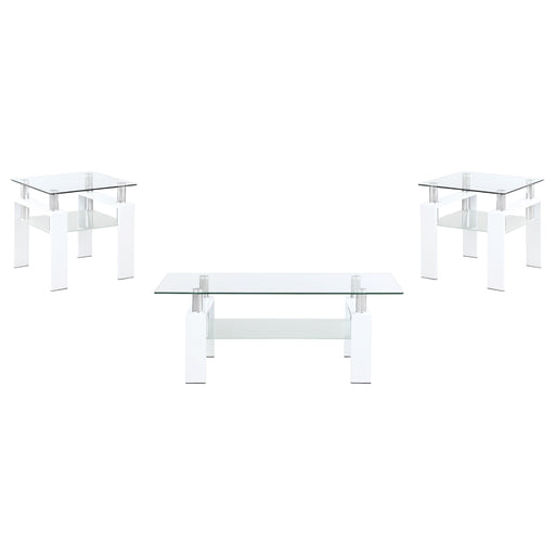 CoasterThis ultra-modern coffee table set pairs sleek white high-gloss finishes with clear tempered glass shelves for a contemporary aesthetic. Crafted fr...