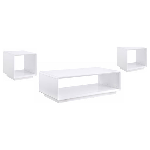 CoasterThis coffee table set embodies modern minimalism with a sleek white high gloss finish over durable engineered wood. The cocktail table features a l...