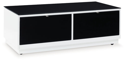 Signature Design by Ashley®Combining a high-gloss white finish with a black glass tabletop, this coffee table proves opposites really do attract. It's the perfect blend of mo...