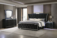• LED-lit wingback bed with tufted crown and sculpted sides creates a dramatic focal point