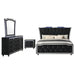 • Bedroom set upholstered in a black velvet with quilted fronts and soft sheen