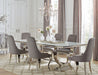 Elevate your dining experience with our 7-piece dining set. The elegant dining table features an expansive opaque white tempered glass surface. Its stainless steel trestle base, adorned with gleaming chrome-finish ring-shaped end supports, adds a sophisticated touch. Complementing the table's opulence, our upholstered side chairs boast soft velvet upholstery and polished chrome legs, blending luxury with comfort. Crafted from stainless steel, these chairs promise durability and opulence. The set includes six expertly cushioned dining chairs, in refined hues, adding curves and excellence. Transform your space into a haven of sophistication, where every meal becomes a lavish experience.