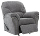 Why sacrifice comfort for style (or style for comfort) when you can have the best of both in this rocker recliner in pewter gray. Elements include a chic divided-back design and pillow top wrapped armrests that make nodding off all too easy. Calling attention to the elegantly flared armrests—black nickel nailhead trim for a punch of cool character.