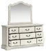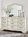 | Details | Includes dresser and mirror, Made with hardwood solids, spruce veneer, MDF substrates and cast resin components, Antiqued white painted finish, 9 drawers with fully finished interiors, French and English dovetail construction and ball-bearing side glides, Metal bar pulls with aged pewter-tone finish, Mirror attaches to back of dresser | |