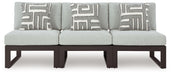 Details Includes 3 modular armless chairs, Made with aluminum and resin wicker, Black finish, All-weather foam cushion core wrapped in soft polyester, Zippered cushions and throw pillows covered in solution-dyed high-performance fabric, Nuvella+™ is an outdoor fabric that can be cleaned and offers enhanced UV resistance, Clean fabric with mild soap and water, let air dry; for stubborn stains, use a solution of 4 oz. bleach to 28 oz. water, Stainless steel hardware, Designed to withstand the harsh elements of the outdoors, 3 throw pillows included, Assembly required
