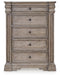 Discover something exceptional with this chest of drawers. Its impressive silhouette offers a casual traditional aesthetic, embodied by classic-inspired columns and a relaxed grayish brown finish. Casually cool drawers with inset framed fronts are packed with ample storage possibilities.