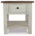 Whether your style is farmhouse fresh, shabby chic or country cottage, you’ll find this end table dressed to impress. Its two-tone, gently distressed finish pairs weathered oak with antique white for that much more quaint character. Charming elements include a plank-and-frame style top, black faceted hardware and a smooth-gliding drawer for remote controls and more.