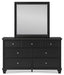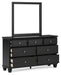 | Details | B687B9: Includes California king panel headboard, footboard and rails, Made with hardwood solids, birch veneer and MDF substrate, Black painted finish, Thick profiled tops, Tapered feet, Foundation/box spring required, sold separately, Mattress available, sold separately, Assembly required, Bed is compatible with an adjustable base, B687B1: Includes dresser and mirror, Made with hardwood solids, birch veneer and MDF substrate, Black painted finish, 7 smooth-gliding drawers with dovetail construction and ball-bearing side glides, Round metal drawer knobs with satin nickel-tone finish, Framed drawer fronts, Tapered feet, Mirror attaches to back of dresser, Assembly required, | |