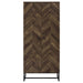 This tall storage cabinet blends rustic charm with modern utility, featuring a rustic oak finish and herringbone-patterned door fronts. Made from engineered wood with a scratch-resistant and eco-friendly laminate veneer, it includes multiple fixed shelves behind two doors for efficient vertical storage. A black metal base provides a sturdy foundation and industrial contrast, making this cabinet a practical and stylish solution for organizing essentials.