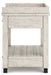 | Details | Made of pine veneers, pine wood and engineered wood, Distressed whitewash finish, 2 smooth-gliding drawers with dovetail construction, 2 open shelves, Vintage patinated bronze-color hardware, Casters for mobility, 2 electrical outlets and USB charging ports, Power cord included; UL Listed, Assembly required | |