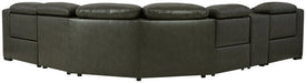 Details Includes left-arm facing power recliner, armless chair, power armless recliner, console with storage, wedge and right-arm facing power recliner, "Left-arm" and "right-arm" describe the position of the arm when you face the piece, One-touch power control with adjustable positions, Easy View™ adjustable headrest and zero-draw USB port, Zero-draw technology only consumes power when the USB receptacle is in use, Corner-blocked frame with metal reinforced seat, Attached cushions, High-quality foam cushions wrapped in poly fiber, 100% top grain leather covers inside areas such as the back, seat and arm cushions; skillfully matched faux leather covers the remaining areas, Due to its natural origin, real leather can show individual characteristics such as healed scars, growth marks, grain variation and shade variation, Natural variations make each hide unique and do not detract from the wearing qualities of leather, Console with 2 cup holders, hidden storage, dual 110V outlets and dual USB charging ports, Zero wall recliner design requires minimal space between wall and chair back, Power cord included; UL Listed