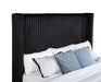 • Queen bed with tall wingback frame and vertical channel tufting in black velvet