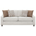 Wrapped in a cheerful, beige woven chenille upholstery, this seating set exudes a look of sophistication. Sloped track arms add elegant lines while tapered dark brown legs add a striking contrast. Understated yet regal, this transitional seating set works inside farmhouse and contemporary style homes effortlessly. Dense and plush boxed seat and back cushions feature classic welt details, as coral and copper tone accent pillows lend a boho-like tough. Add this upholstered furniture set into a space for a subtle chic aesthetic.