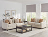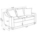 Elevate your living space with this upholstered loveseat, wrapped in soft beige chenille for a cozy yet refined look. Designed with sloped track arms and tapered dark brown wooden legs, it offers a balanced blend of comfort and sophistication. Boxed seat and back cushions with classic welt trim highlight its tailored design, while coordinating accent pillows in copper and coral hues add a subtle touch of contrast. Ideal for modern or transitional interiors, this loveseat provides timeless style and inviting comfort.