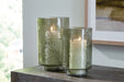 | Details | Set of 2, Made with sanded glass, Green finish, Each holds a 3” pillar candle (candles not included) | |