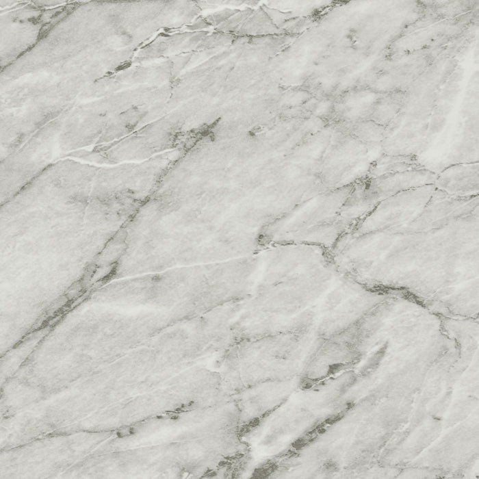 • Faux white marble shelves with rounded edges lend a traditional vibe