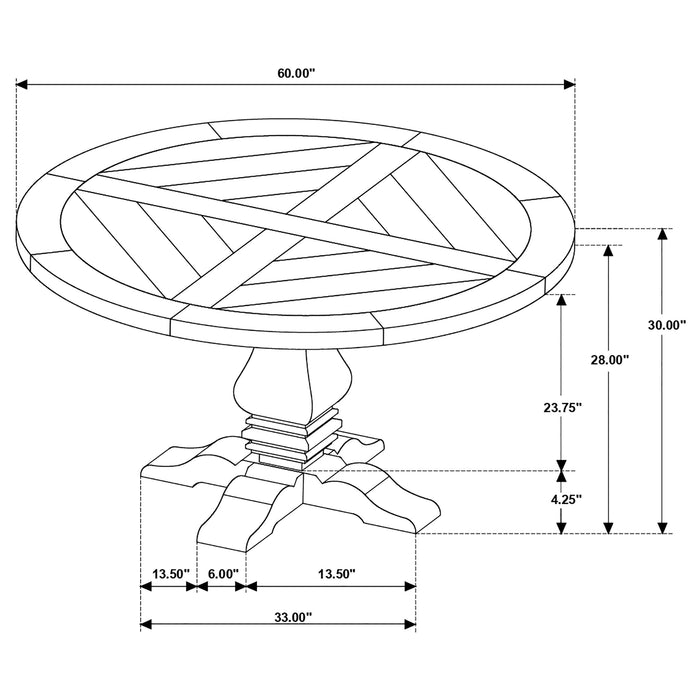 • Wood table features a round top and a decorative pedestal base that adds depth and detail