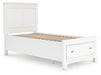 Details Includes panel headboard, storage footboard, rails and roll slats , Made with hardwood solids and MDF substrate, Side rails feature laminated solid hardwood slat support rails (or LVL) with glued and screwed blocking for added strength , White painted finish, Round metal drawer knob with satin nickel-tone finish, Tapered feet, Smooth-gliding drawer in footboard , Bed does not require additional foundation/box spring; accommodates most zero clearance adjustable bases with the addition of a bunkie board , Mattress available, sold separately, Assembly required