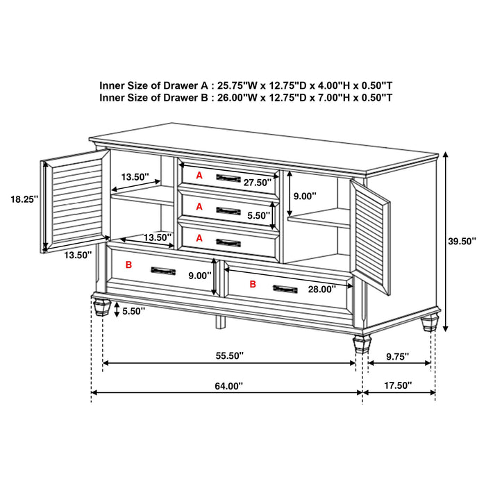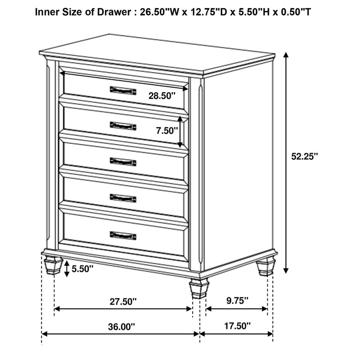 This magnificent 5-piece bedroom set from the Franco collection has chic styling and modern convenience. The imposing headboard and low footboard of the bed are crafted with detailed panels for an elegant look. The durable, roomy drawers on the nightstand, chest, and dresser are conveniently built with soft-closing guides. A handy pull-out service tray is built into the nightstand and includes easy cord access for recharging your gadgets. A large rectangular mirror that easily sits atop the dresser rounds out the set, each piece of which features a handsome finish that adds a rustic ambiance to the bedroom.