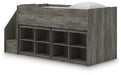 Details Includes loft bed, left storage steps with loft ends, roll slats and 2 loft bookcases, Made with engineered wood (MDF/particleboard/plywood) and decorative laminate for the right balance of affordability and durability, Rustic warm gray finish over replicated oak grain with authentic touch, Decorative laminate replicates natural or man-made material surfaces with consistent color, pattern and texture, 8 storage cubbies, Bed does not require additional foundation/box spring, Mattress available, sold separately, Assembly required