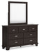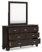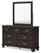 Details B441B4: Includes panel headboard, footboard, rails and slats, Made with hardwood solids, engineered wood veneer and MDF substrates, Dark brown finish, Floating panel headboard, Picture frame footboard, Foundation/box spring required, sold separately , Mattress available, sold separately, Assembly required, B441B1: Includes dresser and mirror, Made with hardwood solids, engineered wood veneer and MDF substrates, Dark brown finish, Metal bar pulls with bright nickel-tone finish, 7 smooth-gliding drawers with dovetail construction and metal center guides, Drawer interiors are lined with a wood grain laminate for a clean, finished look, Top moulding on dresser, Mirror attaches to back of dresser, B441-92: Made with hardwood solids, engineered wood veneer and MDF substrates, Dark brown finish, Metal bar pulls with bright nickel-tone finish, 2 smooth-gliding drawers with dovetail construction and metal center guides, Drawer interiors are lined with a wood grain laminate for a clean, finished look, Top moulding,