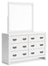| Details | B427B4: Includes full panel headboard, footboard, rails and slats, Made with hardwood solids, okoume veneer and MDF substrates, White finish, Foundation/box spring required, sold separately, Mattress available, sold separately, Assembly required, B427B1: Includes dresser and mirror, Made with hardwood solids, okoume veneer and MDF substrates, White finish, 6 drawers with dovetail construction and metal center guides, Hardware with dark finish, Drawer interiors are lined with a wood grain laminate for a clean, finished look, Mirror attaches to back of dresser, B427-46: Made with hardwood solids, okoume veneer and MDF substrates, White finish, 5 drawers with dovetail construction and metal center guides, Hardware with dark finish, Drawer interiors are lined with a wood grain laminate for a clean, finished look, B427-92: Made with hardwood solids, okoume veneer and MDF substrates, White finish, 2 drawers with dovetail construction and metal center guides, Hardware with dark finish, Drawer interiors are lined with a clean wood grain laminate for a clean, finished look, | |