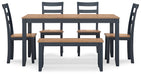 Complement your home’s simply relaxed sensibility with this dining table, chairs and bench. A dark blue hue offers a chic contrast to the natural wood tone, for a casual look that vibes with a variety of aesthetics. Whether you're sipping your morning coffee, settling in for dinner or working from home, this set is smartly designed for everyday comfort and style.