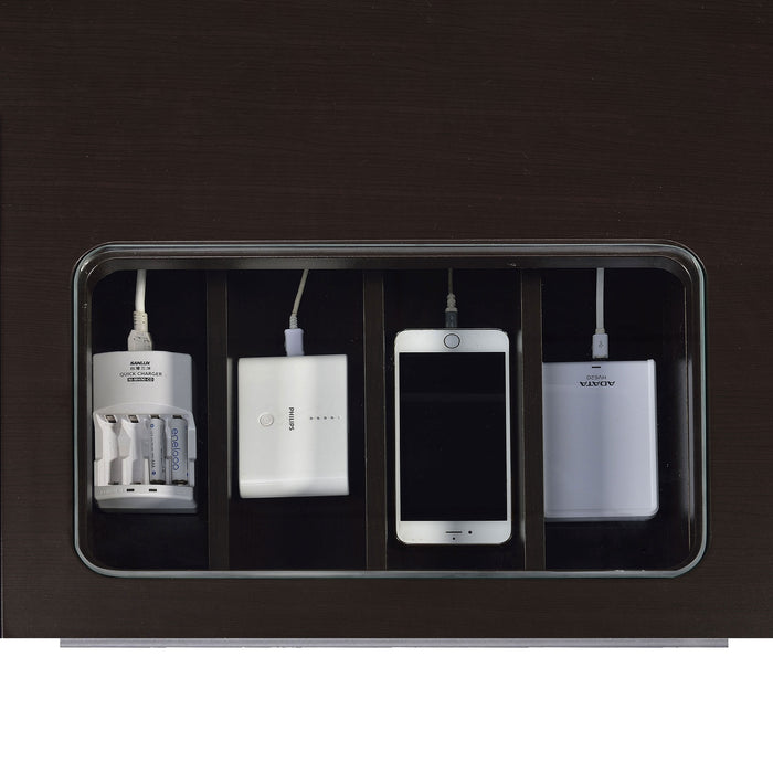 Upgrade your workspace with the Halston computer desk, offering a blend of functionality and modern design. Finished in rich cappuccino, this rectangular desk features two drawers, a keyboard tray with smooth Euro glides, and a cabinet with an adjustable shelf for versatile storage. A clear tempered glass inset on the top allows visibility of devices, while a lift-top compartment conceals a convenient built-in power outlet. Its streamlined form and durable engineered wood construction make it ideal for any contemporary home office.