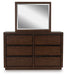 Details PCB857B6: Includes canopy, upholstered headboard, footboard, rails, posts and slats, Made with hardwood solids, mango wood veneer and MDF substrates , Side rails feature laminated solid hardwood slat support rails (or LVL) with glued and screwed blocking for added strength, Complex, rich dark brown finish, Foam headboard cushion with polyester upholstery , Measure room, including ceiling height, to ensure bed clears fans and light fixtures, Foam cushion with polyester upholstery , Foundation/box spring required, sold separately , Mattress available, sold separately , USB-A and USB-C charging ports, Power cord included; UL Listed, Assembly required, PCB857B1: Made with hardwood solids, mango wood veneer and MDF substrates , Complex, rich dark brown finish, Full-length metal rail pulls with matte black finish, 6 smooth-gliding drawers with fully finished interiors, dovetail construction and heavy-duty ball-bearing side glides (top drawers felt lined), Mirror attaches to back of dresser, Soft rounded pilasters, Raised plinth base, PCB857-46: Made with hardwood solids, mango wood veneer and MDF substrates, Complex, rich dark brown finish, Metal rail pulls with matte black finish, 5 smooth-gliding drawers with fully finished interiors, dovetail construction and heavy-duty ball-bearing side glides (top drawer felt lined), Soft rounded pilasters, Raised plinth base, PCB857-92: Made with hardwood solids, mango wood veneer and MDF substrates, Complex, rich dark brown finish, Metal rail pulls with matte black finish, 2 smooth-gliding drawers with fully finished interiors, dovetail construction and heavy-duty ball-bearing side glides (top drawer felt lined), Soft rounded pilasters, Raised plinth base,