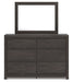 Details PCB3370B8: Includes headboard panel, headboard posts, footboard and rails, Made with engineered wood (MDF/particleboard/plywood) and decorative laminate for the right balance of affordability and durability , Dark charcoal finish over replicated oak grain, Decorative laminate replicates natural or man-made material surfaces with consistent color, pattern and texture, Foundation/box spring required, sold separately, Mattress available, sold separately, Assembly required, PCB3370B1: Includes dresser and mirror, Made with engineered wood (MDF/particleboard/plywood) and decorative laminate for the right balance of affordability and durability , Dark charcoal finish over replicated oak grain, Decorative laminate replicates natural or man-made material surfaces with consistent color, pattern and texture, Recessed hand grabs create hardware-less effect, 6 smooth-gliding drawers, Drawer interiors are lined with a faux linen laminate for a clean, finished look , Safety is a top priority, clothing storage units are designed to meet the most current standard for stability, ASTM F 2057 (ASTM International), Drawers extend out to accommodate maximum access to drawer interior while maintaining safety, Mirror attaches to back of dresser; can also be mounted on wall horizontally or vertically, Assembly required,