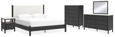 Cadmori King Upholstered Panel Bed with Mirrored Dresser, Chest and Nightstand