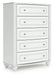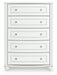 Details Made with engineered wood (MDF/particleboard/plywood) and decorative laminate for the right balance of affordability and durability, Matte white finish, Decorative laminate replicates natural or man-made material surfaces with consistent color, pattern and texture, Crystal drawer knobs, 5 smooth-gliding drawers, Drawer interiors are lined with a faux linen laminate for a clean, finished look, Safety is a top priority, clothing storage units are designed to meet the most current standards for stability, ATM F 2057 (ASTM International), Drawers extend out to accommodate maximum access to drawer interior while maintaining safety, Minor assembly required