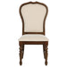 The combination of ivory upholstery and a rich brown wood finish creates clean, precise style for this traditional round dining set. Its crafted in quality rubberwood and engineered wood, delivering strength and durability paired with turned details. The table features a spacious r with a decorative edge and charming base design. Chairs add rounded, framed backs and plush foam cushions, perfect for leisurely meals with family and friends. The set lends handsome, refined character in your dining room or kitchen.