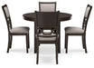 Details Includes dining table and 4 upholstered chairs, Table made with rubberwood solids, mindi veneer and MDF substrates, Chair made with wood and engineered wood, Cherry brown finish, Tabletop has reverse diamond patterned veneer, Thick tapered legs, Lower shelf, Chair with light beige polyester upholstery, Foam cushioned seat and backrest, Chair backrest features fretwork accent, Seats up to 4, Assembly required
