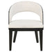 Gather in grounded elegance with this dining set, where sculptural form and graceful texture meet. A bold round pedestal table anchors the space in a burnished black finish, its open base and soft curves inviting conversation and connection. Surrounding it, barrel-back arm chairs cradle each guest in cream fabric and cushioned ease. From candlelit evenings to morning rituals, this set is a quiet celebration of balance, beauty, and belonging.