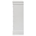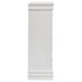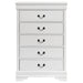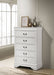 Complete your stylish bedroom with the ample storage provided by this transitional five-drawer chest. It's cool white finish blends in a variety of bedroom spaces, creating a fresh, approachable look. Each drawer features a hanging pull in a dark finish, creating a touch of character and contrast. Molded trim and bracket feet complete the look with a hint of movement. Use the top for a valet or jewelry box or choose decor that adds a personal touch.
