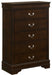 The Louis Philippe collection features this 5-piece bedroom set that is well-suited for a youth or guest bedroom. The Full bed (also available in Eastern King, Queen, and Twin) has a slightly flared headboard and footboard for added styling. The nightstand and chest have spacious drawers featuring dovetail construction and handy yet stylish silver bail handles. The dresser features drawers with similar construction and accents as well as enough space on top for the rectangular mirror with clean lines to complete the look. This traditional style set is crafted from select hardwoods and wood veneer and with a warm cappuccino finish for an elegant appeal.