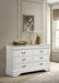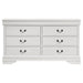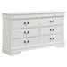 Create a central space for clothing and accessories with a transitional six-drawer dresser. Built for versatility, it boasts a crisp white finish with contrasting dark hanging pulls on its drawer fronts. Each drawer delivers smooth performance with a center metal glide and provides easy organization for clothing and personal effects. The dresser offers a wide top for all sorts of decor and personal items, while molded trim adds dimension and depth to your bedroom decor. Bracket feet are a stylish finishing touch.