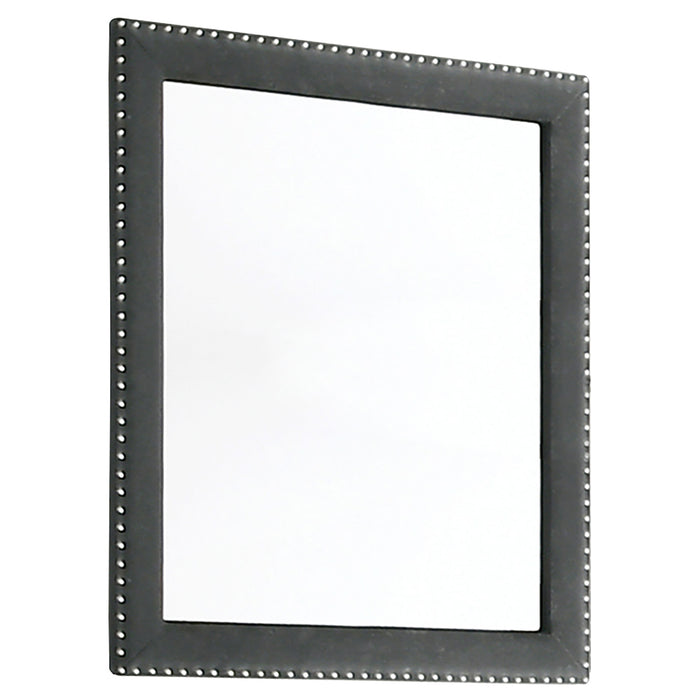 Accent your sleeping space like never before with this five-piece bedroom set. A dramatically large wingback headboard towers over the bed to make a grand display, featuring button tufting and nail head trim. A matching dresser comes equipped with six spacious drawers with nail head trim around the frame, coordinating with the matching mirror and five-drawer chest. The two-drawer nightstand is a must-have for storing bedside essentials. All pieces are upholstered in a luxurious velvet fabric.