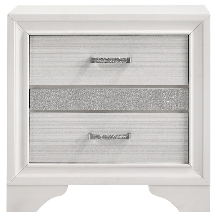 Stylish and ultra-chic, this glamorous, five-piece bedroom set is the ultimate in modern luxury. A bed, nightstand, dresser, mirror, and chest are all included, giving you everything you need to complete your bedroom ensemble. The mattress-ready platform bed offers the added bonus of footboard storage. The dresser, nightstand, and chest are also equipped with roomy drawers to maximize storage space. Glittery stripes and rhinestone detailing add a brilliant touch of bling to this exquisite bedroom set.