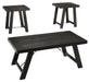 Details Includes coffee table and 2 end tables, Made of Acacia veneers, wood and engineered wood, Distressed black wash finish, Canted legs with stretchers, Tops have a bread board layup with a planked effect, Coffee table with tension bars, Assembly required