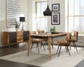The easy, nature-inspired presence of gorgeous wood delivers a tasteful look to this five-piece dining set, a super choice for any space. Start fresh with a set anchored by a natural finish sheesham table with a spacious rectangular top and tapered, rounded legs. A dark apron with geometric design detail adds an energizing effect. Mid-Century Modern influence styles easy side chairs with scoop seats and a thick back, both with channeling. Metal framing features iconic retro slender rounded, splayed legs.