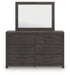 Details Includes dresser and mirror, Made with engineered wood (MDF/particleboard/plywood) and decorative laminate for the right balance of affordability and durability, Dark charcoal finish over replicated oak grain, Decorative laminate replicates natural or man-made material surfaces with consistent color, pattern and texture, Large handles with black finish, 6 smooth-gliding drawers, Framed front and pilasters, Mirror attaches to back of dresser; can also be mounted on wall horizontally or vertically , Safety is a top priority, clothing storage units are designed to meet the most current standard for stability, ASTM F 2057 (ASTM International), Drawers extend out to accommodate maximum access to drawer interior while maintaining safety, Minor assembly required