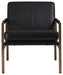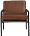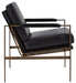 This accent chair has an ultra-modern vibe and indulgent feel. Its metal frame is a chic complement to brown leather seating. With its bronze-tone finish and urban industrial style, this accent chair impresses with high-end looks priced to entice.