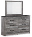 | Details | B1290B2: Includes queen panel headboard/footboard and rails, Made with engineered wood (MDF/particleboard/plywood) and decorative laminate for the right balance of affordability and durability, Smoky gray finish over replicated oak grain with authentic touch, Decorative laminate replicates natural or man-made material surfaces with consistent color, pattern and texture, Foundation/box spring required, sold separately, Mattress available, sold separately, Assembly required, Bed is compatible with an adjustable base, B1290B1: Includes dresser and mirror, Made with engineered wood (MDF/particleboard/plywood) and decorative laminate for the right balance of affordability and durability, Two-tone look: smoky gray replicated oak grain accented with rustic charcoal finish; replicated oak grain with authentic touch, Charcoal finish over replicated oak grain with authentic touch, Decorative laminate replicates natural or man-made material surfaces with consistent color, pattern and texture, Large-scaled handles in a dark hue, 6 smooth-gliding drawers with dovetail construction, Drawer interiors are lined with a faux linen laminate for a clean, finished look, Framed front and pilasters, Mirror attaches to back of dresser; can also be mounted on wall horizontally or vertically, Safety is a top priority, clothing storage units are designed to meet the most current standard for stability, ASTM F 2057 (ASTM International), Drawers extend out to accommodate maximum access to drawer interior while maintaining safety, Assembly required, | |