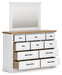 | Details | B844B2: Includes panel headboard, storage footboard, rails and roll slats, Footboard made with hardwood solids, MDF substrates and butcher block oak veneer, Headboard and rails made with hardwood solids and MDF substrates, White finish, Headboard with inset black metal barn sash, 2 drawers in footboard with fully finished interior, dovetail construction and ball-bearing side glides, Pulls with matte black finish, Bed does not require a foundation/box spring, Mattress available, sold separately, Assembly required, B844B1: Includes dresser and mirror, Made with hardwood solids, MDF substrates and butcher block oak veneer, Dresser with 2-tone finish (white finish; butcher block oak veneer with natural finish), Pulls with matte black finish, 10 spacious drawers with fully finished interiors (top drawers felt lined), dovetail construction and ball-bearing side glides , Drawers with inset picture fronts, Mirror attaches to back of dresser, B844-93: Made with hardwood solids, MDF substrates and butcher block oak veneer, 2-tone finish (white finish; butcher block oak veneer with natural finish), Pulls with matte black finish, 3 spacious drawers with fully finished interiors (top drawers felt lined), dovetail construction and ball-bearing side glides, 110V power supply with dual USB charging ports, Power cord included; UL Listed, Drawers with inset picture frame fronts, | |