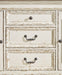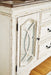 Details Made of veneers, wood and engineered wood, Antiqued two-tone finish, 3 smooth-gliding drawers with dovetail construction and felt bottoms, Bail pulls and knobs in dark bronze tone finish, Pair of cabinet doors with inset mirrored glass and decorative fretwork, 2 adjustable shelves, Assembly required