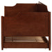 This modern classic-style daybed with trundle merges timeless elegance with practical design. The camelback silhouette and refined panel detailing add sophistication, while its construction from rubberwood, plywood, MDF, and cherry veneer ensures durability. The rich cherry finish highlights the natural wood grain, enhancing its classic appeal. Included slats provide reliable mattress support, and the smooth-gliding trundle with four wheels offers convenient additional sleeping space.